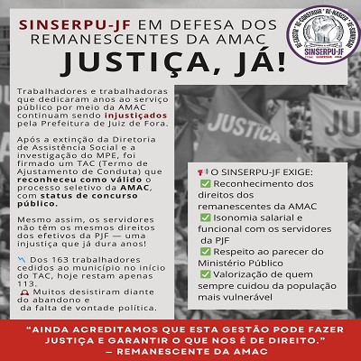 O SINSERPU-JF manifesta seu profundo pesar pelo falecimento da servidora municipal Saraline Correia. Nutricionista dedicada no PAM-Marechal, Saraline era admirada por sua competência e pelo espírito de companheirismo que contagiava a todos. Sua partida prematura é uma perda imensurável para o serviço público [...]
