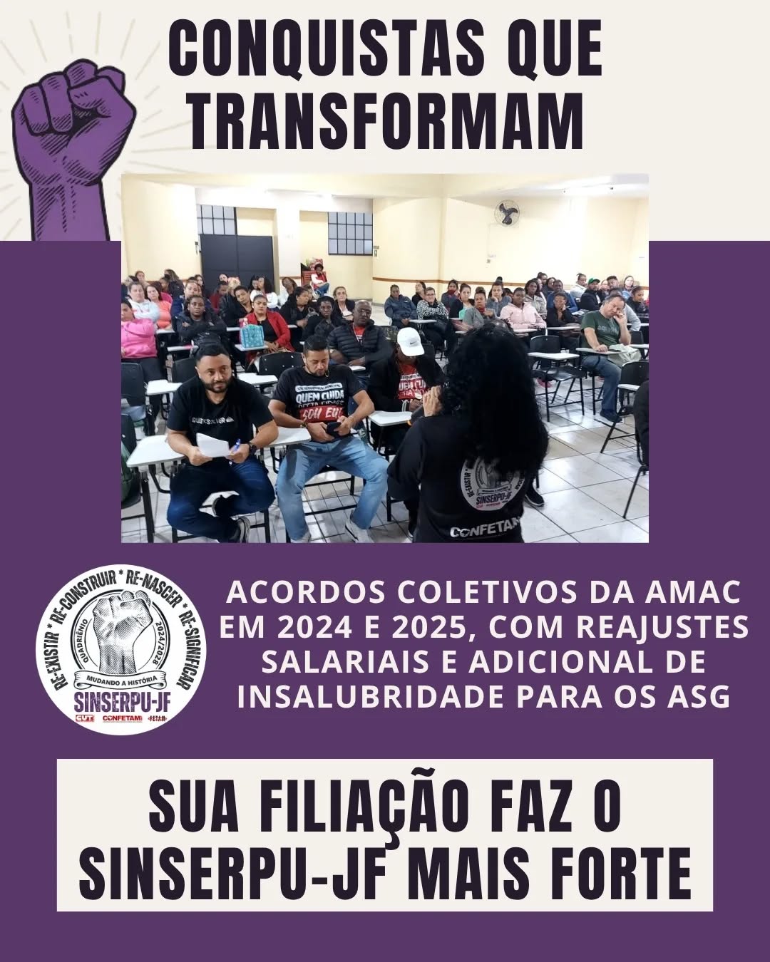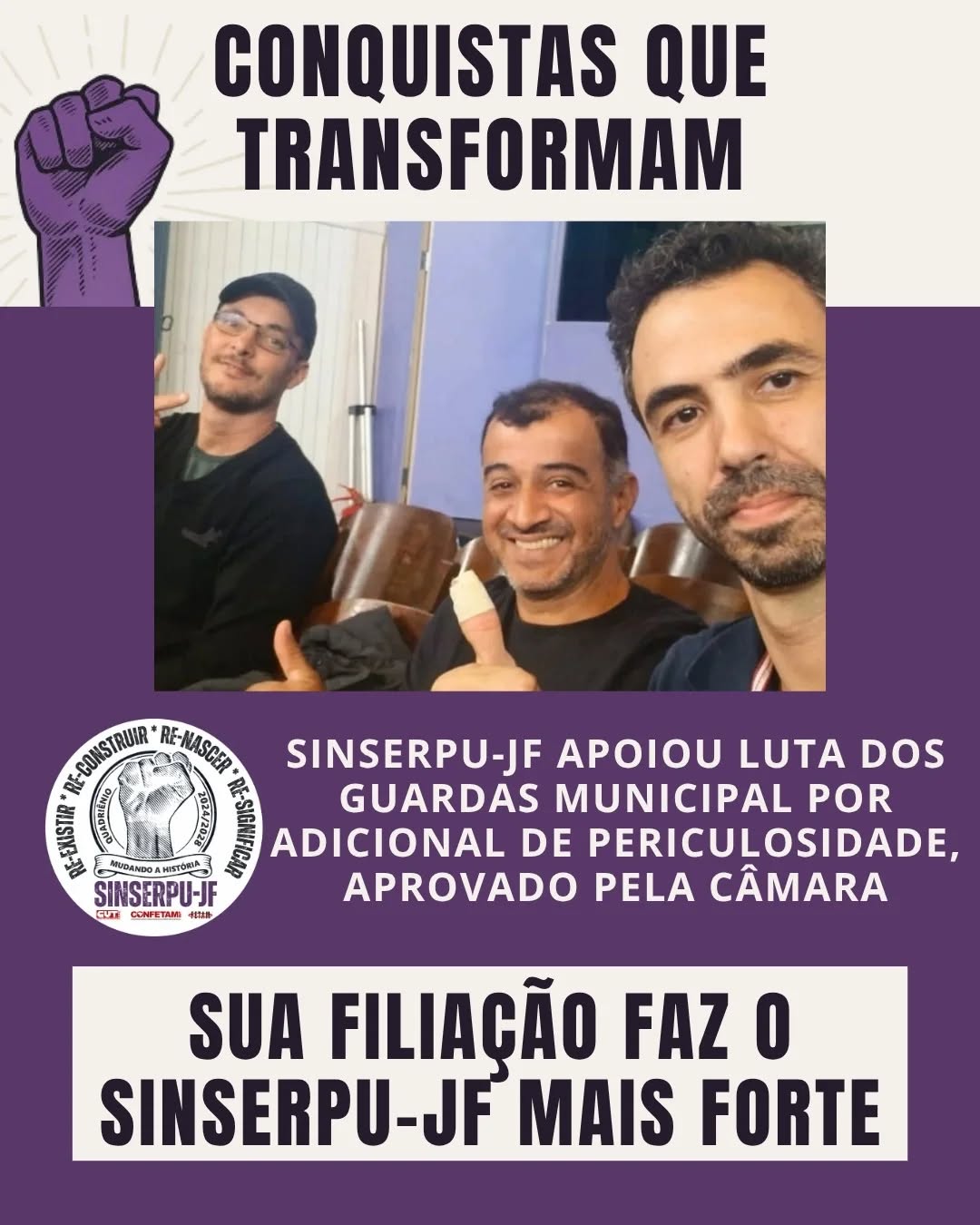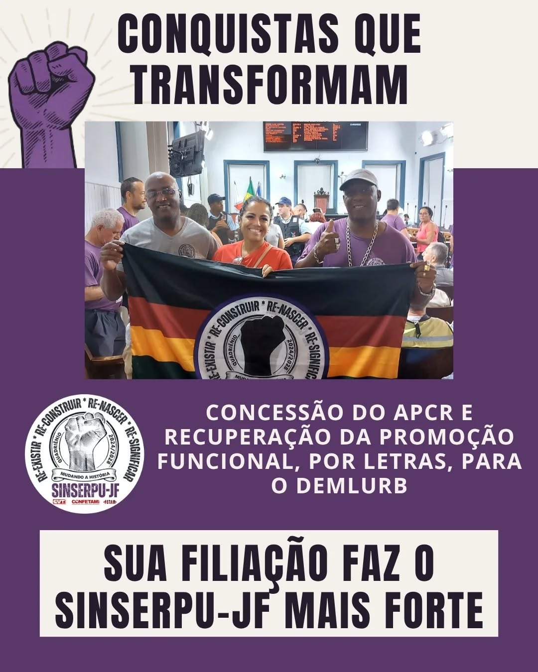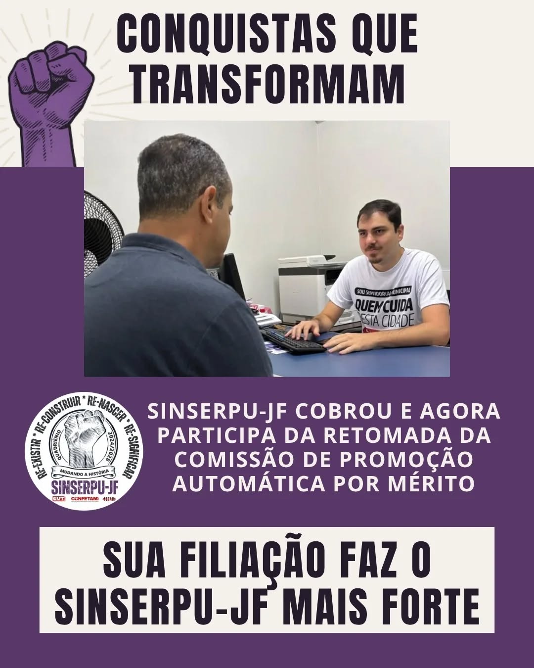 Neste mês de julho, a nova gestão do SINSERPU-JF celebra a sua atuação na defesa dos direitos dos servidores e servidoras de Juiz de Fora apresentando a série “Conquistas que Transformam”. Trazemos aqui as vitórias históricas que obtivemos nos últimos meses e reforçamos que essas conquistas só são possíveis graças à participação de cada servidor e servidora municipal. Juntem-se a nós nessa luta! Filia-se e entre para a família SINSERPU-JF!