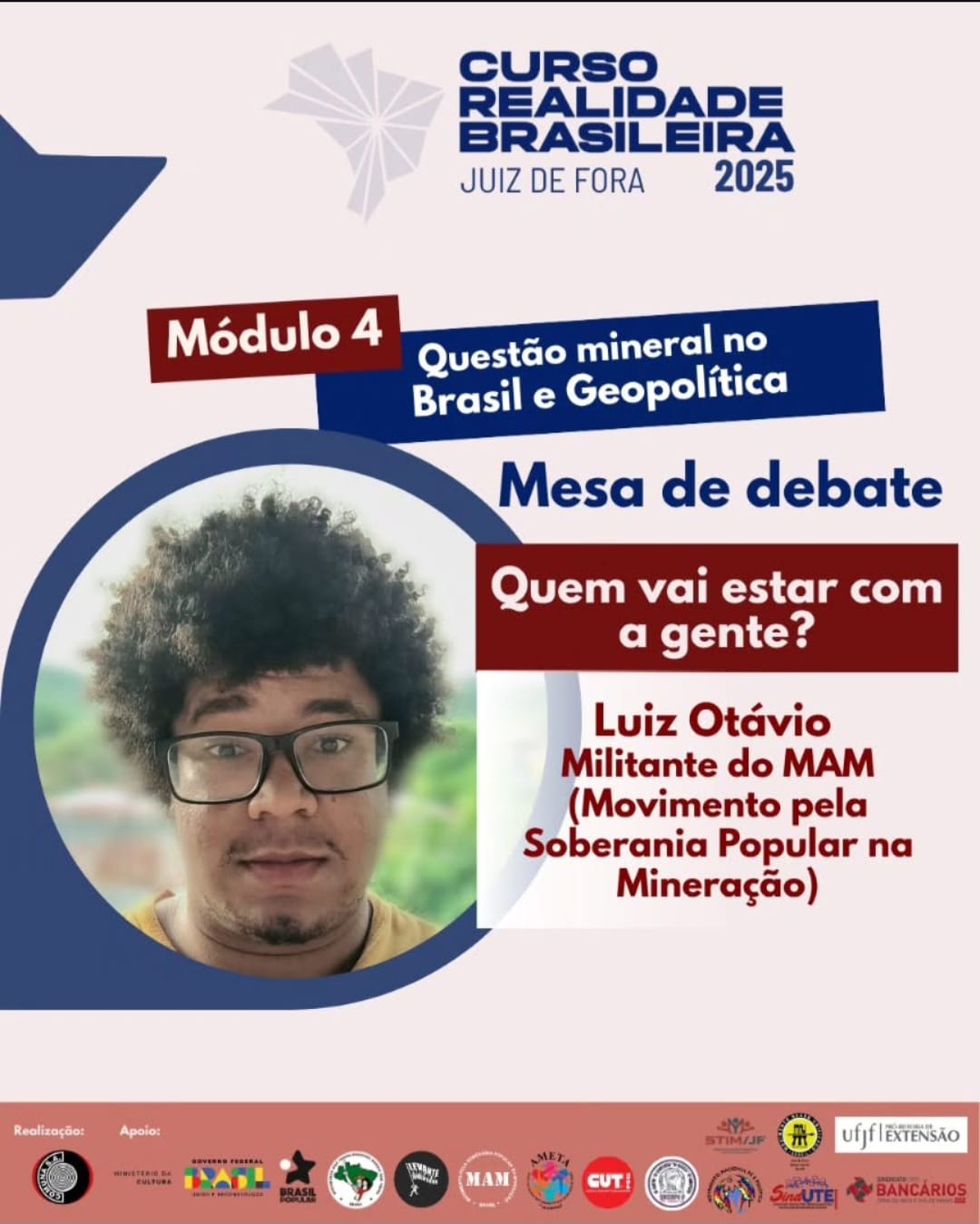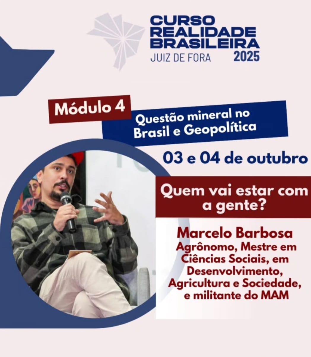 Os participantes do Curso de Realidade Brasileira/CRB, entre eles o diretor de Base do SINSERPU-JF Claudio Dias, vão experimentar um novo formato no 4º Módulo, que acontece neste final de semana. O tema central é “Questão Mineral no Brasil e Geopolítica”, mas uma Mesa de Debates, nesta sexta-feira (3 de outubro), a partir das 18h30, vai incluir “Mineração, Crise Climática e Educação Ambiental”, com a participação da Professora Angélica Cosenza (coordenadora do GEA-UFJF/Grupo de Estudos e Pesquisas em Educação Ambiental da Universidade Federal de Juiz de Fora e diretora da FACED/Faculdade de Educação da UFJF) e de Luiz Otávio (militante do Movimento Popular pela Soberania na Mineração/MAM). No sábado (4 de outubro), os estudos sobre o tema continuam, a partir das 8h – também na Casa dos Conselhos, Rua Halfeld, 450, 7º andar – com a presença de Marcelo Barbosa (agrônomo, mestre em Ciências Sociais e em Desenvolvimento, Agricultura e Sociedade).