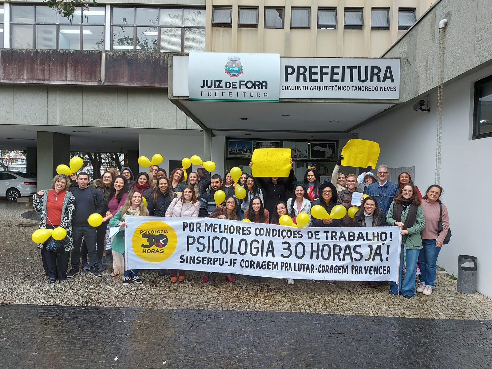 Com o apoio do SINSERPU-JF, os psicólogos da PJF fizeram, na tarde desta segunda-feira (28 de agosto), um Ato político pela jornada de 30 horas semanais. Eles ocuparam parte do Paço Municipal (pátio da entrada da Prefeitura) para protestar contra a morosidade da Administração Municipal em relação à demanda e leram uma carta, que será entregue oportunamente à prefeita Margarida Salomão (PT), em mãos, e onde consta as justificativas para o pedido de redução da jornada, atualmente em 40 horas semanais. “É uma demanda urgente, pela saúde física e mental nossa e da nossa família. E também em nome de um melhor atendimento à população de Juiz de Fora, pois está provado que a redução da jornada aumenta a eficiência funcional”, diz Sara Ribeiro Carvalho, do “Coletivo de Psicólogos da PJF”.