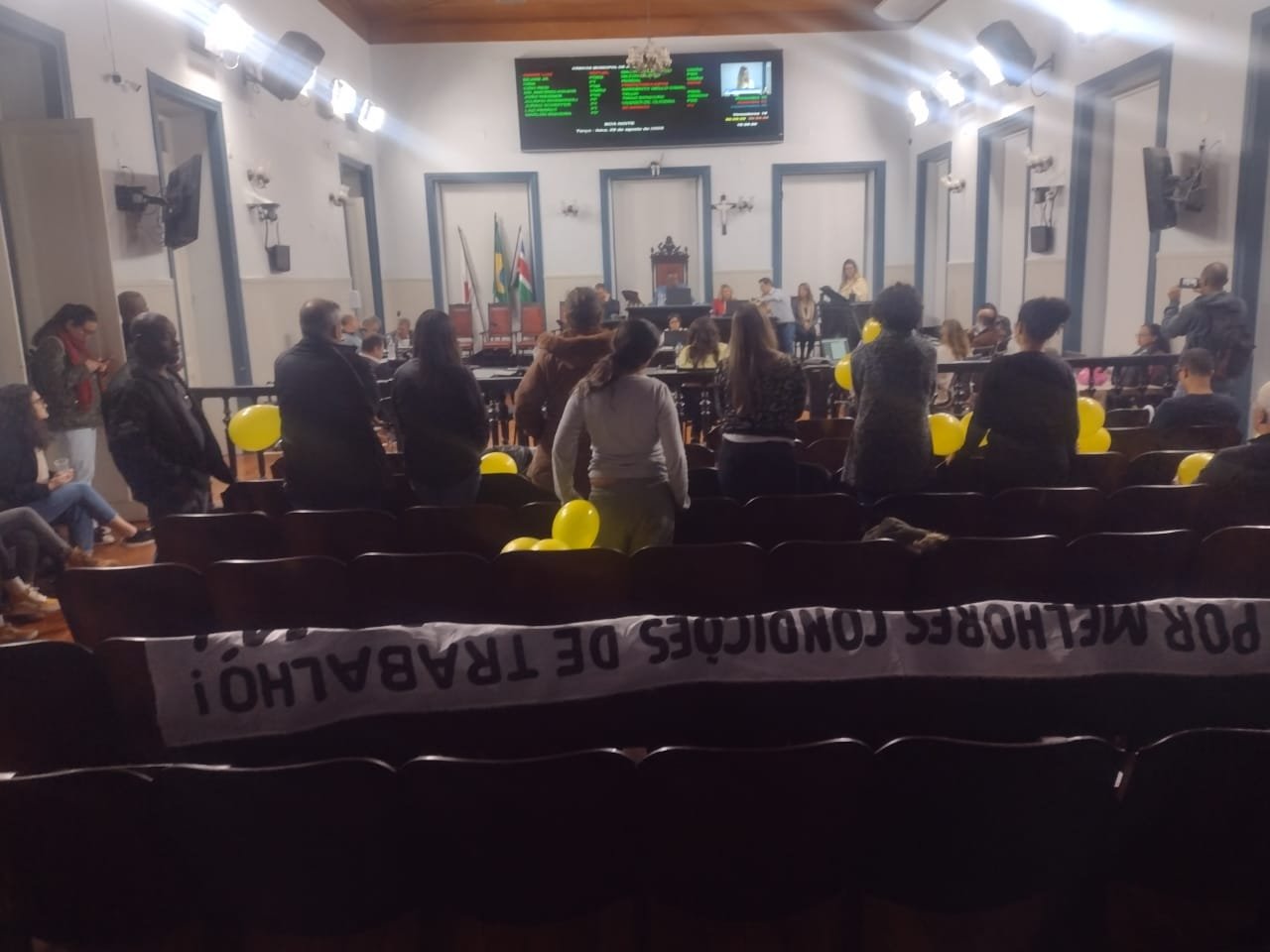 Em mais um ato pela jornada de trabalho de 30 horas, o “Coletivo de Psicólogos da PJF” ocupou, na noite desta terça-feira (29 de agosto), a “Tribuna Livre” da Câmara Municipal de Juiz de Fora. Sara Ribeiro Carvalho e Luciana Krempser representaram a categoria e durante cerca de 20 minutos argumentaram sobre a necessidade de reduzir a carga horária. “É uma medida fundamental para assegurar a saúde física e mental do profissional, que precisa desse tempo para se recuperar e estar bem psiquicamente para um atendimento assertivo”, disse Sara, que acrescentou a informação que há na Câmara Federal e na Assembleia Legislativa de Minas projetos em tramitação que tratam da redução da carga horária. “No Estado do Piauí e em cidades como Araraquara (SP) e Unaí (MG) a jornada de 30 horas já é uma realidade”, exemplificou ela. “Só um período menor de trabalho atenua a nossa rotina intensa e tensa”, completou Luciana.
