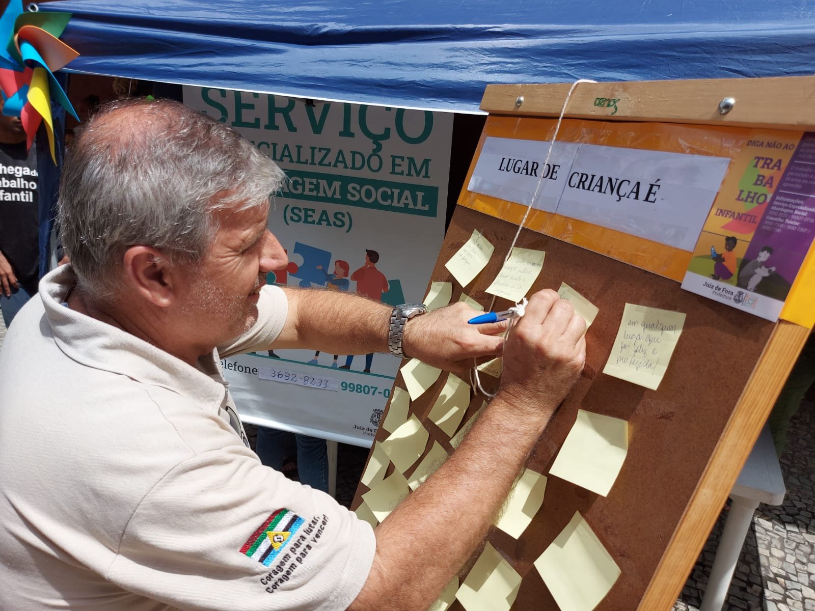 Francisco Carlos, presidente do Sindicato, aproveitou a campanha, paralela, “Diga Não ao Trabalho Infantil” e, no painel “Lugar de Criança é…”, escreveu: “…Na escola, junto com a sua família, na presença da sociedade e na presença de Deus”.