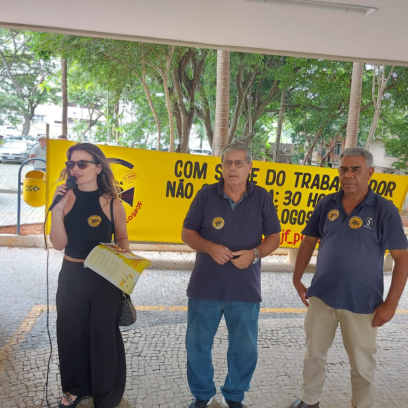 A presidenta do SINSERPU-JF, Deise Medeiros, acompanhada do vice-presidente Weber Wagner e dos diretores Anderson Gonçalves [...]
