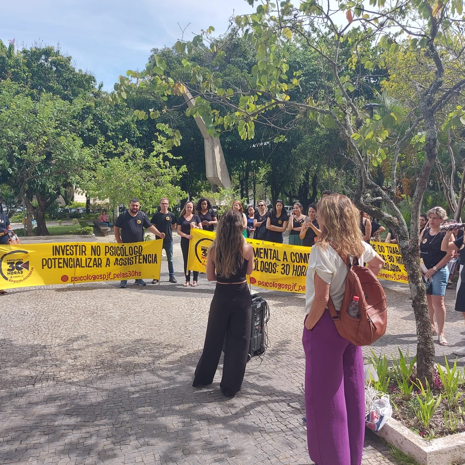 Com o apoio – logístico, político e jurídico – do SINSERPU-JF, os psicólogos da PJF fizeram, na tarde desta terça-feira (6 de fevereiro), um ato reivindicatório pela jornada das 30 horas semanais. Eles se concentraram na porta da Prefeitura, na Avenida Brasil, na esperança de serem recebidos pela prefeita Margarida Salomão (PT), a quem atribuem a prerrogativa, política principalmente, do envio de um projeto de lei para a Câmara Municipal regulamentando a jornada requerida há anos – recentemente, a Chefe do Executivo vetou um projeto de lei aprovado pelos vereadores sobre o tema, alegando justamente inconstitucionalidade pelo vício da origem da matéria.