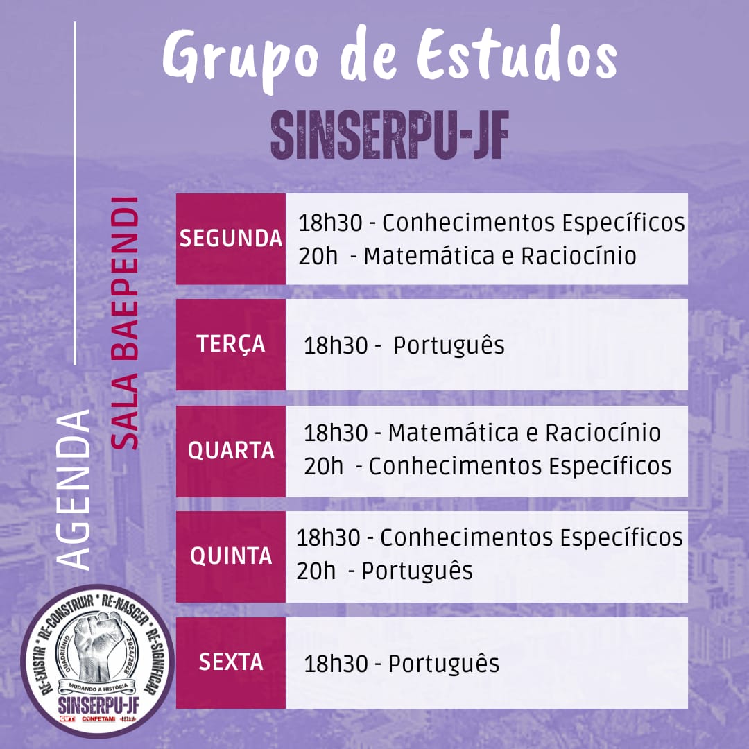 Foram definidos o tempo de duração e os horários do grupo de estudos promovido pelo SINSERPU-JF, de preparação para o concurso do DEMLURB. As reuniões serão das 18h30 às 21h30, de segunda a sexta-feira, na sede do Sindicato (Rua São Sebastião, 780, Centro) para candidatos a auxiliares de serviço; e na Sala Baependi (Rua Halfeld, 805, Centro) para candidatos a motoristas. Hoje (segunda-feira, 5 de agosto), no Sindicato, às 18h30, o SINSERPU-JF vai recepcionar os inscritos e distribuir, gratuitamente, o material didático. As atividades de aprendizagem começam amanhã (terça-feira, 6 de agosto) e se estendem até o dia 6 de setembro – ou seja, por cinco semanas. Neste período, os inscritos (filiados ao Sindicato e seus dependentes) participarão de grupos de estudos de Português, Matemática e Raciocínio Lógico e Conhecimentos Específicos, com a ajuda dos facilitadores Cristian Nunes de Morais, Francisco Nunes dos Santos Júnior, Tânia Maria de Assis Machado, Victor Hugo Medeiros Pessanha e Weber Wagner Rodrigues Silva – Veja, nos quadros abaixo, os horários dos grupos, com as respectivas matérias.