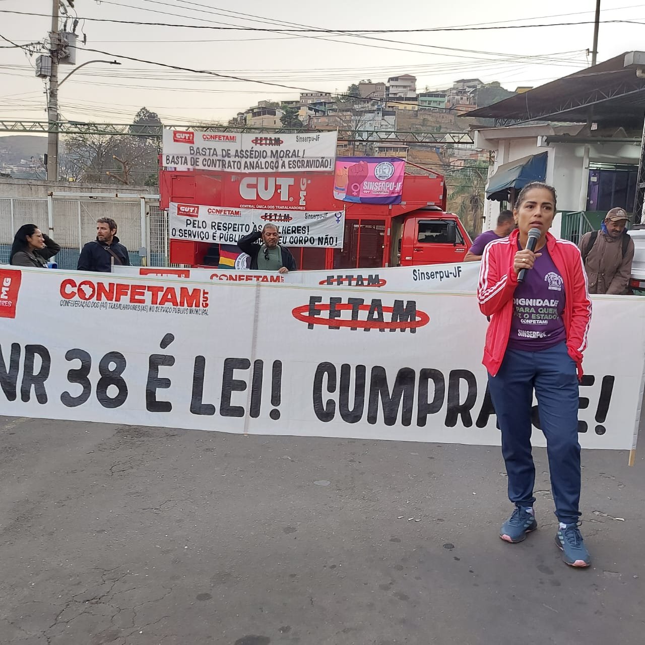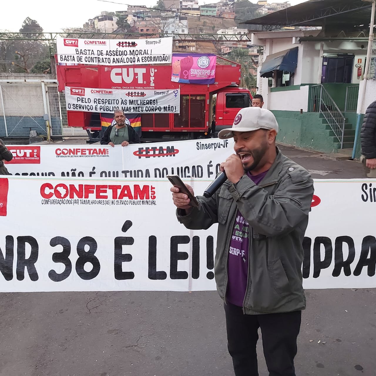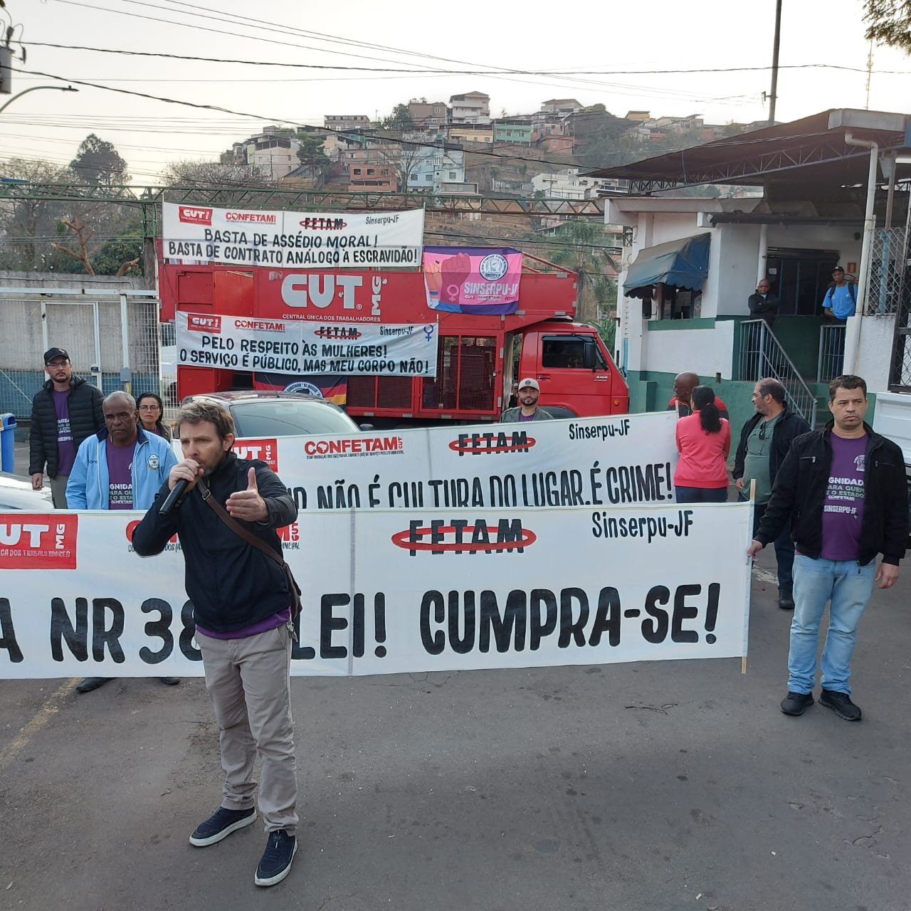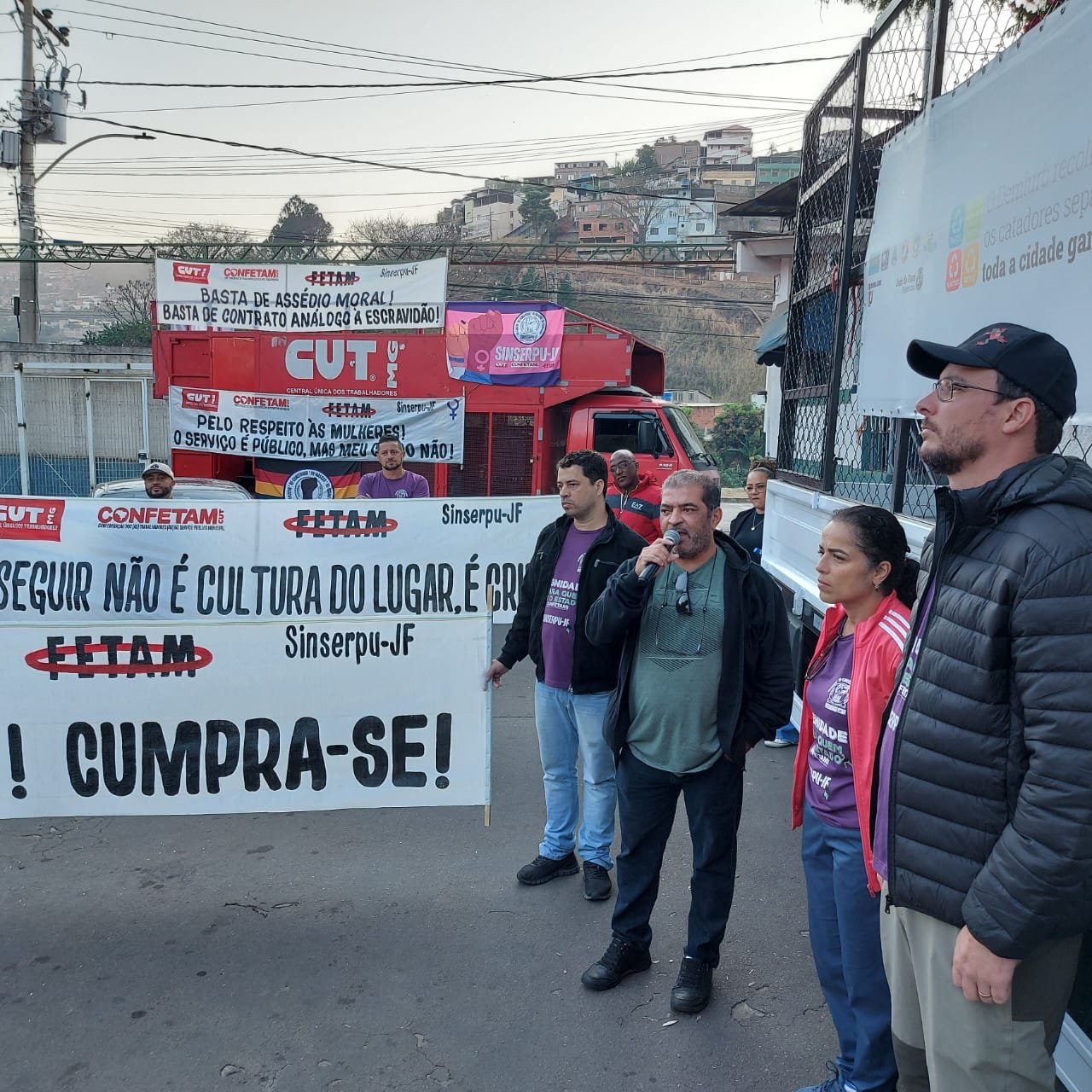 Vários outros diretores do SINSERPU-JF amanheceram no DEMLURB, com carro de som (emprestado à CUT/Central Única dos Trabalhadores) e faixas que traziam alusões a um fato grave ocorrido recentemente (“Pelo respeito às mulheres” e “O serviço é público, mas meu corpo não”) e também com citações às situações recorrentes no Departamento: “Perseguir não é cultura do lugar, é crime”, “Basta de assédio moral”, “Chega de sucateamento”, “Basta de contrato análogo à escravidão” e “A NR 38 é lei. Cumpra-se” – em referência à Norma Regulamentadora número 38, sobre segurança e saúde no trabalho nas atividades de limpeza urbana e manejo de resíduos sólidos.