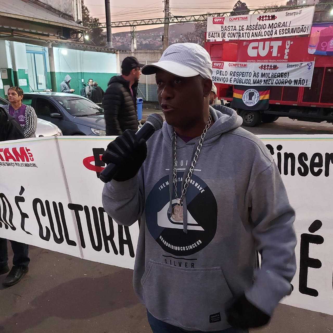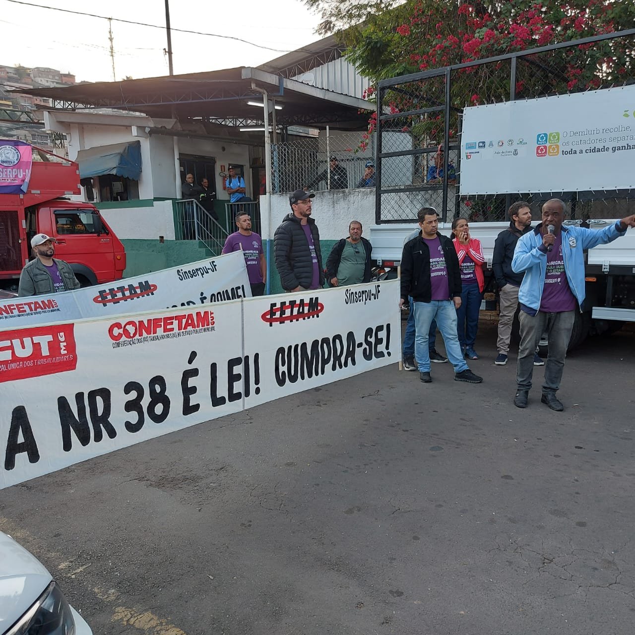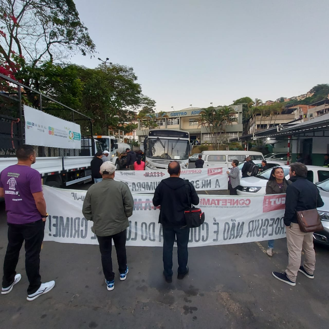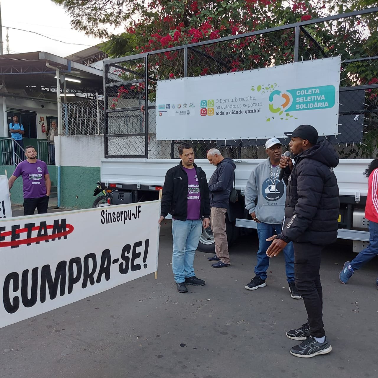 Vários outros diretores do SINSERPU-JF amanheceram no DEMLURB, com carro de som (emprestado à CUT/Central Única dos Trabalhadores) e faixas que traziam alusões a um fato grave ocorrido recentemente (“Pelo respeito às mulheres” e “O serviço é público, mas meu corpo não”) e também com citações às situações recorrentes no Departamento: “Perseguir não é cultura do lugar, é crime”, “Basta de assédio moral”, “Chega de sucateamento”, “Basta de contrato análogo à escravidão” e “A NR 38 é lei. Cumpra-se” – em referência à Norma Regulamentadora número 38, sobre segurança e saúde no trabalho nas atividades de limpeza urbana e manejo de resíduos sólidos.