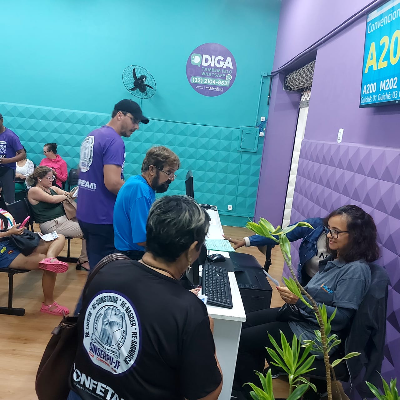 Na manhã desta quinta-feira (24 de abril), os diretores do SINSERPU-JF Weber Wagner (vice-presidente) e Irlan Pereira (Comunicação e Cultura) e a conselheira fiscal do Sindicato, Vera Lúcia Daniel, estiveram no DIGA (Departamento de Informação Geral e Atendimento), na galeria do PAM Marechal, para panfletar e conscientizar a população sobre a Operação Tartaruga dos Agentes de Atendimento ao Público (AAPs).