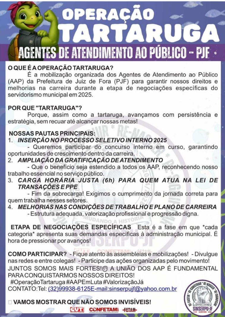 A Operação Tartaruga foi decidida na Assembleia da categoria realizada no dia 15 de abril. Começou terça-feira (22 de abril), vai até amanhã (sexta-feira/25 de abril) e tem como objetivo principal chamar a atenção para as demandas principais dos AAPs: Inserção no processo seletivo interno 2025; ampliação da gratificação de atendimento; carga horária justa (6h) para quem atua na Lei de Transações e PPE e melhorias nas condições de trabalho e Plano de Carreira