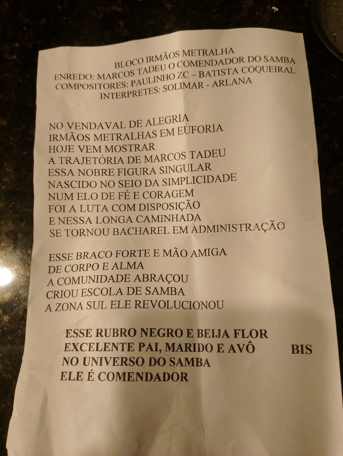 “Marcos Tadeu, o Comendador do Samba” (homenagem a uma das figuras mais queridas e respeitadas do Carnaval juizforano) foram apresentadas com o apoio da bateria da Escola de Samba Partido Alto. Ao final, venceu, e ganhou o prêmio de R$ 1 mil, o samba composto por Paulinho ZC e Batista Coqueiral e interpretado por Arlana.