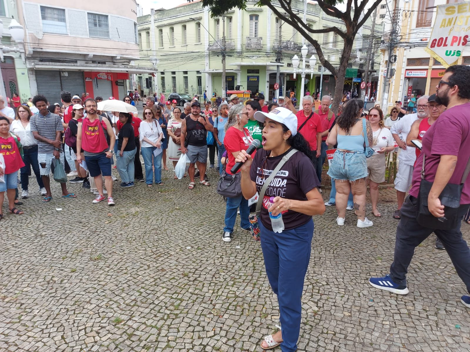 No Ato, realizado na Praça da Estação, ela estava acompanhada dos diretores do SINSERPU-JF Irlan Pereira (Comunicação e Cultura), Agnaldo Jailson (Relações Institucionais), Tania Assis (Formação Sindical) e Bernadete de Paula (Base), e do conselheiro fiscal do Sindicato, Luiz Carlos Torres Júnior “Kaizin”.