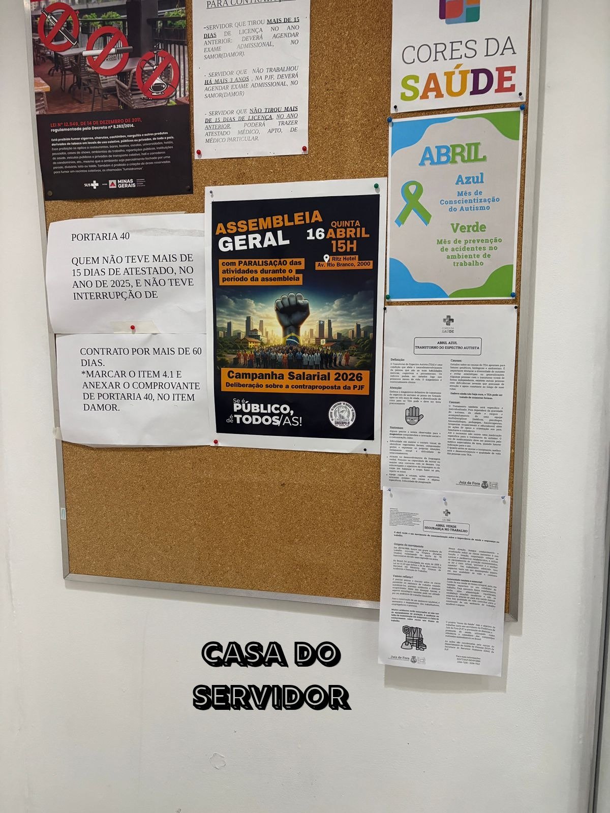 Durante toda esta terça-feira (14 de abril), os diretores do SINSERPU-JF Irlan Pereira (Comunicação Social e Cultura) e Claudio Dias (Base) percorreram vários setores da Administração Municipal intensificando a convocação dos servidores para a Assembleia da Campanha Salarial 2026 – que acontece na próxima quinta-feira (16 de abril), às 15h, no Hotel Ritz.